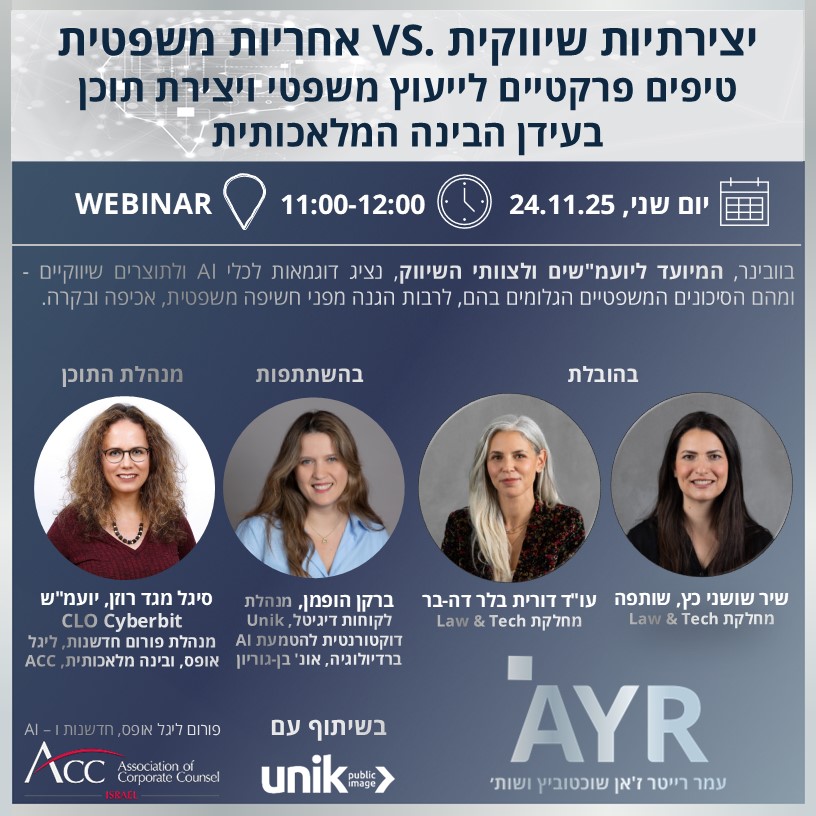 התפתחות הדיגיטל והבינה המלאכותית הנגישה את חדוות היצירה לכולם בעזרת gen-AI. מחלקות השיווק נעזרות בכלי הבינה המלאכותית לערוצי שיווק השונים: ניסוחי ניוזלטר ללקוחות; עיצוב תמונות לסושיאל; שימוש בדמות AI כפרזנטור; ועוד. כלים אלה יכולים לחסוך הרבה משאבים לארגון, אך עלולים לייצר חשיפה משפטית. בוובינר ייחודי – המיועד ליועצים משפטיים ולצוותי השיווק – נחשוף דוגמאות לתוצרים שיווקיים כאמור, ולכלי AI שבהם משתמשים (או חוששים להשתמש) – ונעזור לכם למפות את הסיכונים הגלומים בהם, לרבות הגנה מפני חשיפה משפטית, אכיפה ובקרה. להרשמה
