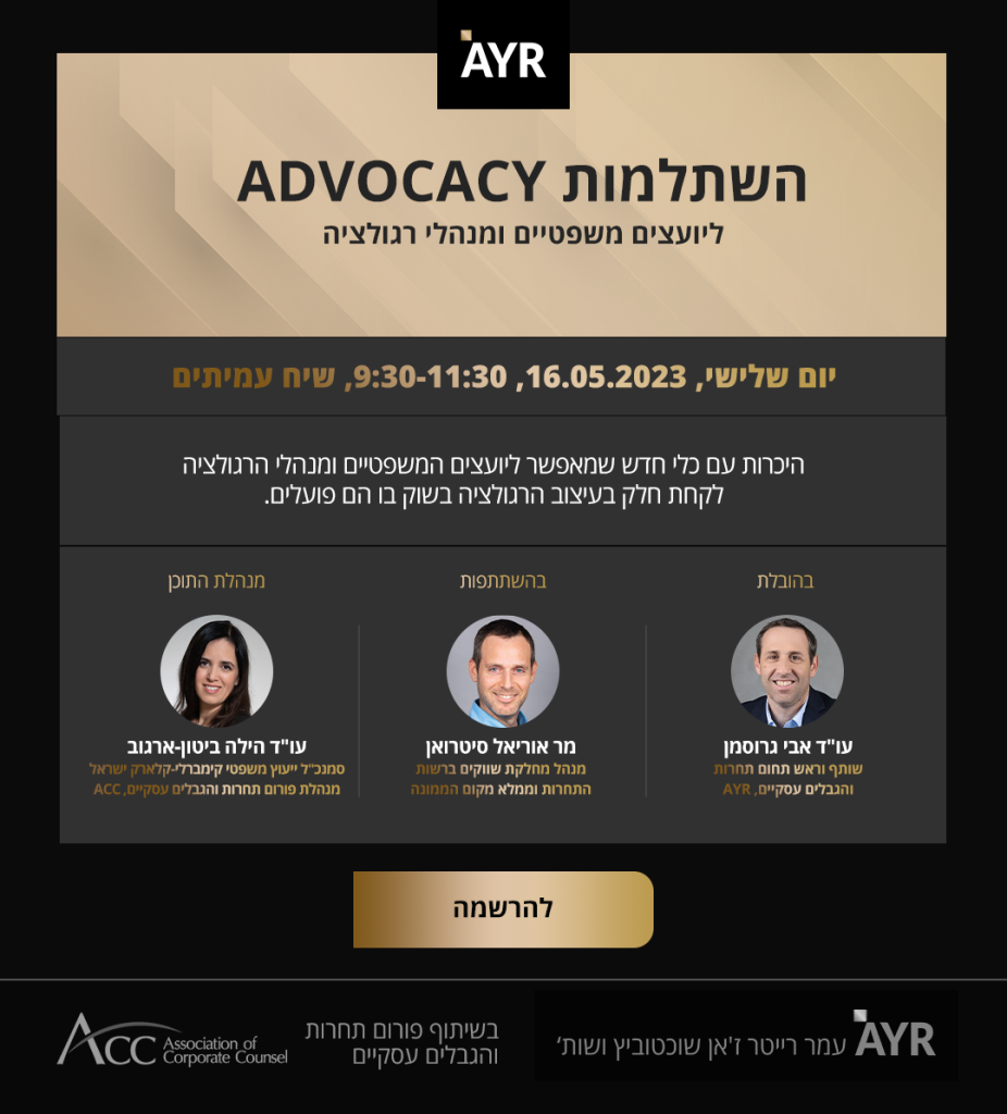 אנו מזמינים את היועמ"שים הפנימיים ומנהלי הרגולציה באותן חברות להשתלמות שתעסוק בנושא ותועבר ע"י עו"ד אבי גרוסמן, ראש תחום תחרות והגבלים עסקיים במשרדנו, ולשעבר בכיר ברשות התחרות.