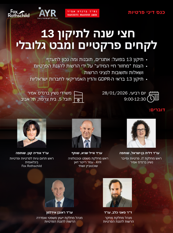 הכנס בשיתוף מחלקות הגנת הפרטיות של משרד נשיץ ברנדס אמיר ופירמת AYR – עמר רייטר ז'אן שוכטוביץ ושות', בהובלת השותפים וראשי המחלקות – עו"ד דלית בן-ישראל ועו"ד אייל שגיא, ובהשתתפות עו"ד ראובן אידלמן, היועץ המשפטי של רשות הגנת הפרטיות, שישתף על זוית הרשות ופעולות האכיפה של תיקון 13.